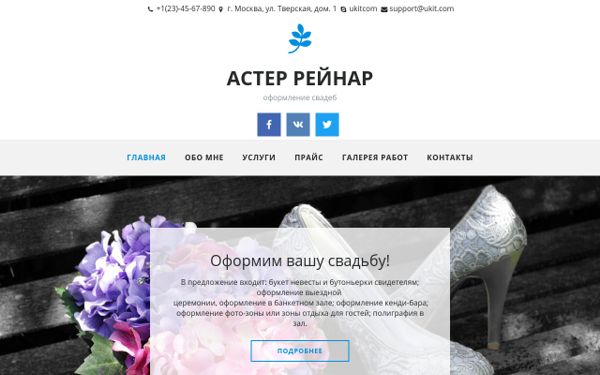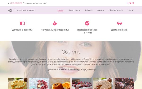 покажите примеры работ и расскажите о своём мастерстве, используя этот красочный шаблон. На главной странице по умолчанию созданы карточки популярных товаров и услуг. Есть блок со специальным предложением и галерея с лучшими работами. На отдельной странице создан блог, в котором можно делиться секретами декорирования и приобретать статус эксперта с помощью полезных материалов.