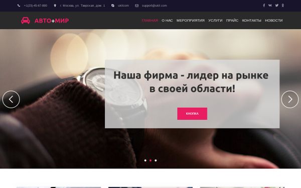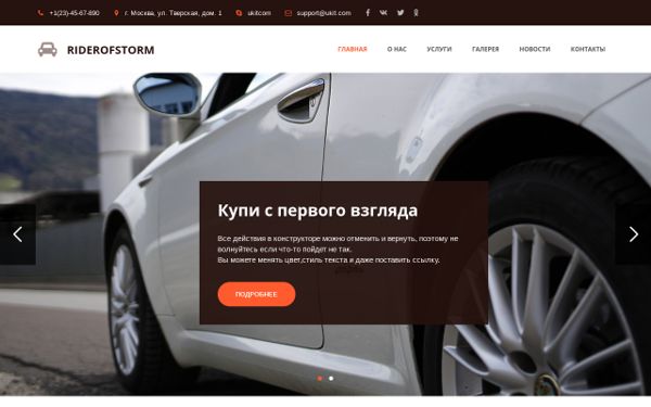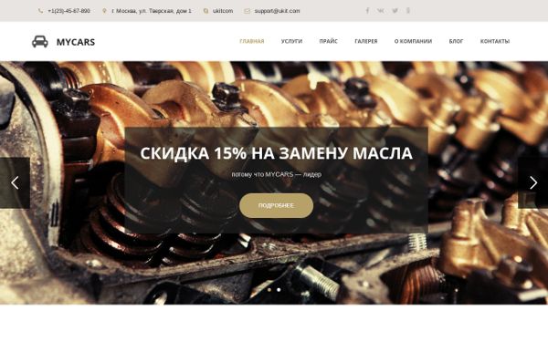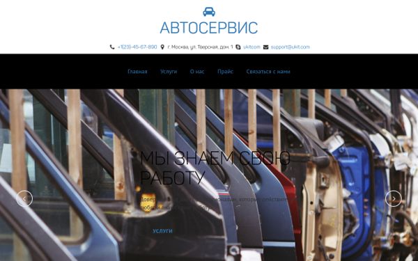 универсальный макет, который можно за несколько часов превратить в привлекательный сайт, используя встроенные инструменты визуального редактора uKit. Дизайн подходит для создания разных проектов, связанных с автомобилями — это может быть как продажа товаров, так и оказания услуг: например, ремонта или проката. Для решения этих задач на сайте есть раздел с прайсом и галерея, предназначение которой можно свободно менять.