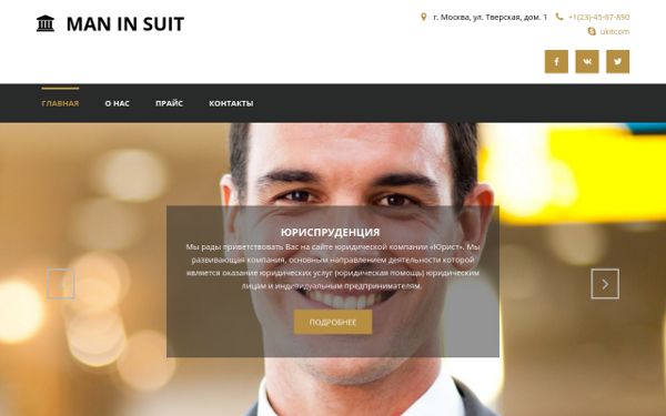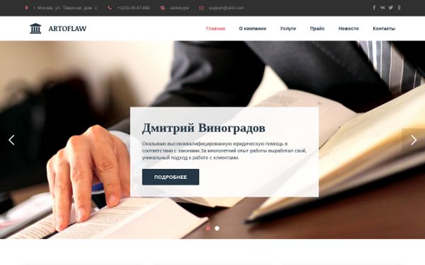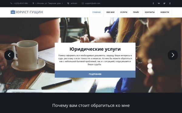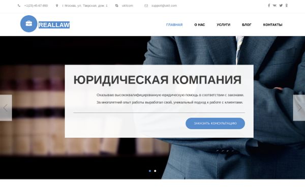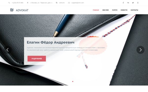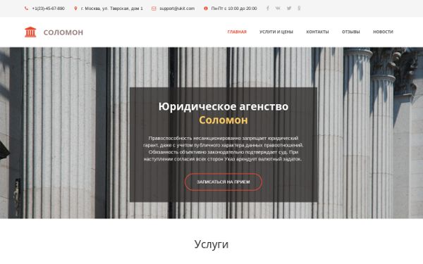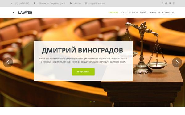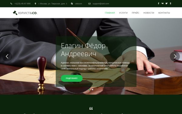хороший макет для сайта юридической тематики с акцентом на списке оказываемых услуг. На главной странице можно посмотреть основные направления деятельности компании или юриста. Подробности об услугах и ценах размещены в специальном разделе. Есть также отдельная страница с отзывами клиентов, при этом часть их выводится на главную страницу. Создан раздел «Новости», в котором можно публиковать важные сообщения о работе компании.