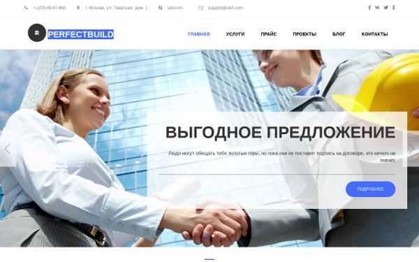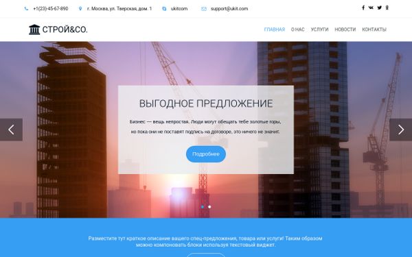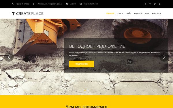 современный шаблон для компании, работающей в сфере оказания услуг ЖКХ. Подробная информация о фирме, список преимуществ и отзывы клиентов увеличат уровень доверия, а карточки товаров и услуг помогут показать доступные для заказа виды работ. Кроме списка услуг есть раздел «Блог», в котором можно размещать новости компании или статьи, касающиеся коммунальных работ.