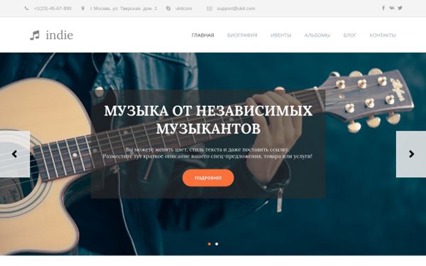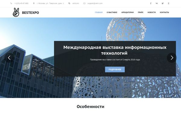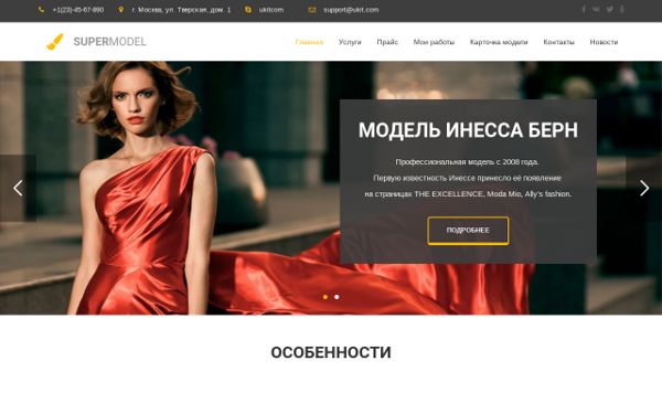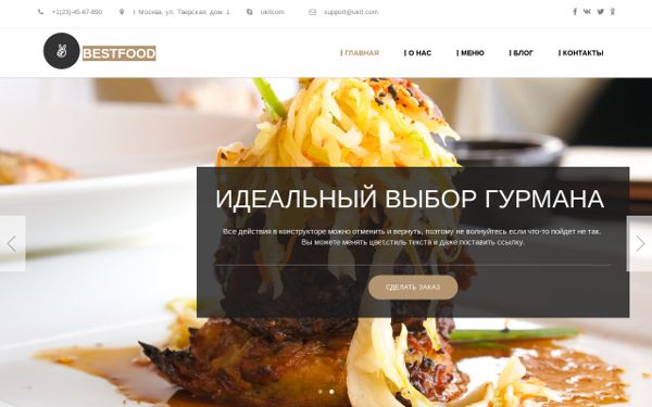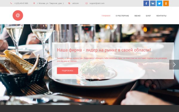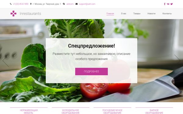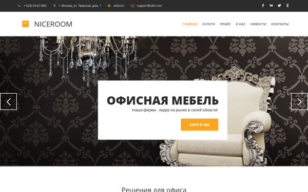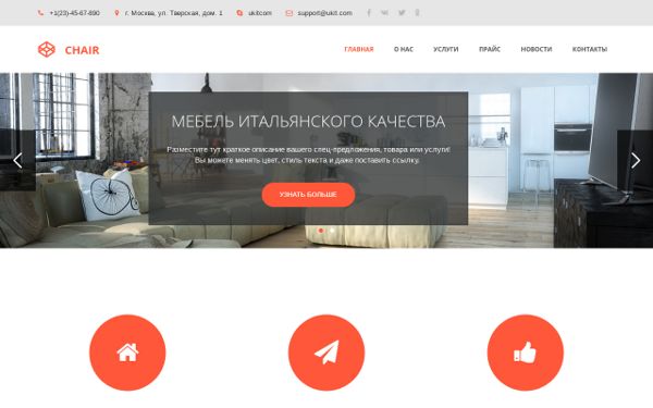 функциональный шаблон, готовый к запуску продаж дизайнерской мебели и аксессуаров. На сайте реализован каталог, ссылки на который размещены в главном меню и на слайдере, встречающем посетителей на главной странице. Есть блоки с популярными товарами, раздел с условиями оплаты и доставки. Форма заказа по умолчанию представлена в виде отправки сообщения администратору сайта, но с помощью инструментов uKit можно добавить полноценную магазинную функциональность.