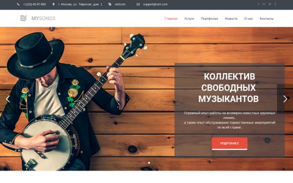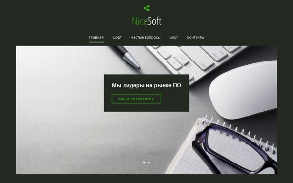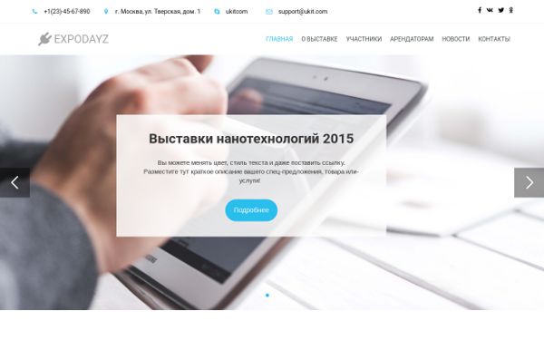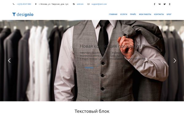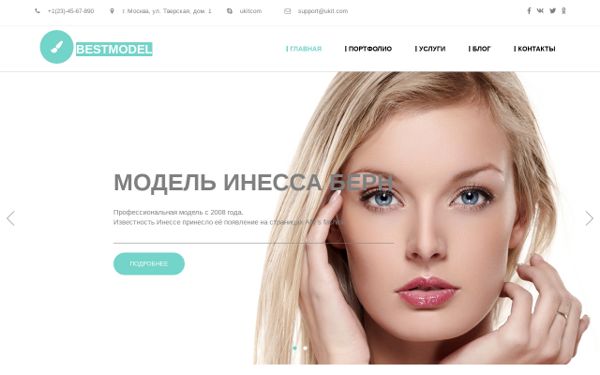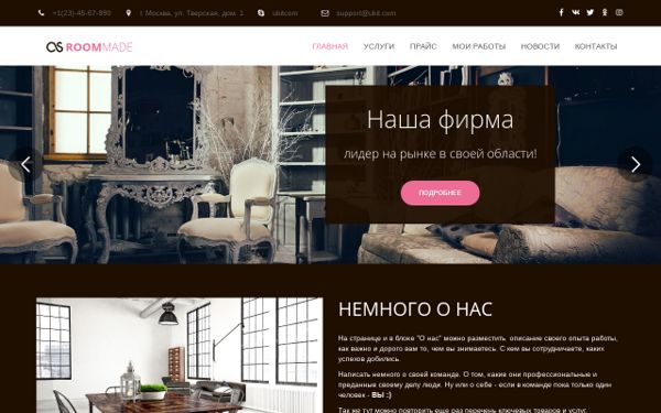 образцовый шаблон для создания сайта студии дизайна. Слайдер на главной странице занимает весь первый экран и демонстрирует посетителям ссылки на разделы, которые могут их привлечь в первую очередь: спецпредложения, акции, выполненные работы. Под информацию о компании, услугах, галерею и новости заведены отдельные страницы, заполненные примерным контентом — вам остаётся его только заменить.