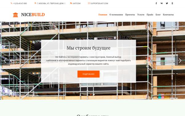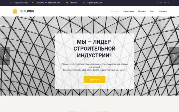 блочный шаблон, идеально демонстрирующий философию архитектурного бюро: современно, чисто, гармонично. Упор сделан на демонстрации примеров выполненных работ. Для этого используются галереи uKit, в которых у фотографий есть подписи. И сами изображения, и описание к ним можно без проблем заменить с помощью инструментов визуального редактирования uKit.