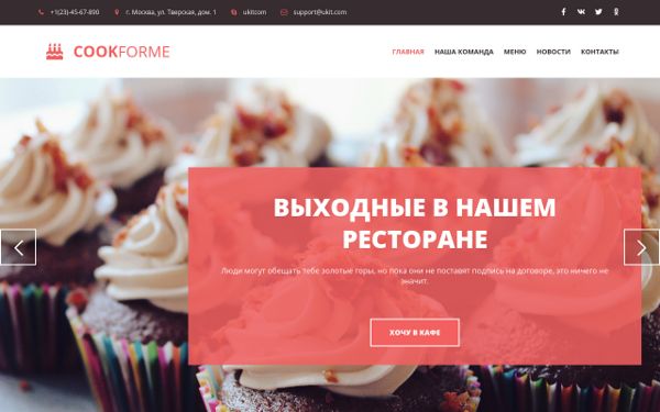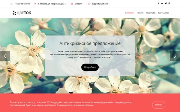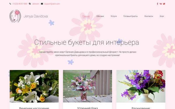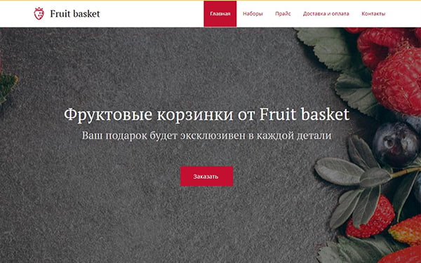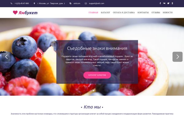 яркий шаблон, который привлечёт внимание к необычным букетам, составленным из фруктов, сладостей и овощей. Макет делает упор на демонстрации работ с помощью сочных фотографий. Вам остаётся только заменить их оригинальными изображениями своих букетов и указать контактные данные для связи, чтобы получить работающий каталог. Встроенные инструменты uKit также позволяют подключить магазинную функциональность с онлайн-оплатой — структурно макет к этому готов.