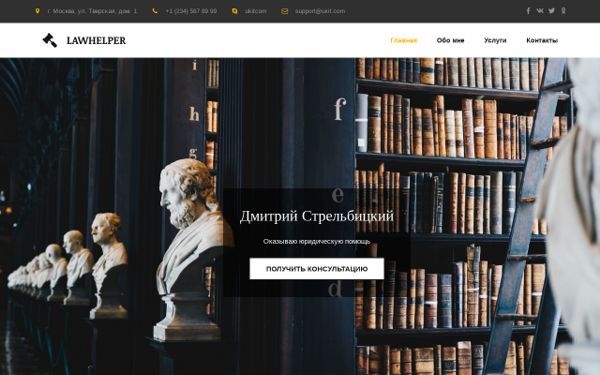 функциональный шаблон для презентации услуг адвоката или юриста. Основная информация размещена на главной странице, но есть также разделы «Обо мне», «Услуги», «Прайс» и «Контакты» со всеми необходимыми подробностями. На главной странице акцент сделан на рассказе об услугах и привлечении внимания к форме записи на бесплатную консультацию. Есть также блок с отзывами клиентов, который помогает сформировать доверительное отношение к специалисту.
