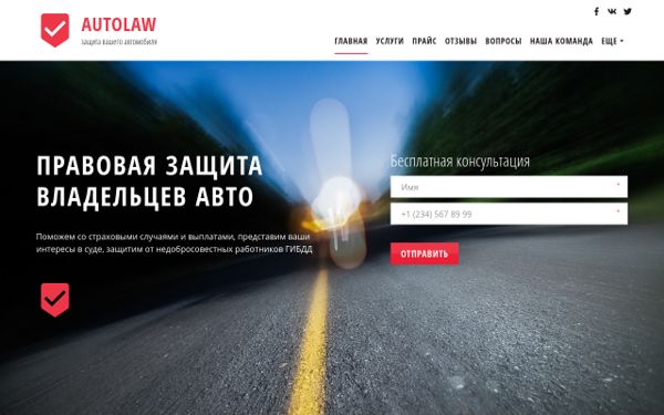 профессиональный шаблон для юридической компании, занимающейся правовой защитой владельцев автомобилей.Первый экран содержит Call-to-Action — предложение записаться на бесплатную консультацию. Ниже расположен блок с карточками услуг и ссылкой на форму обратной связи для их оформления онлайн. На главной странице также есть прайс и отзывы клиентов, которые должны убеждать посетителей сайта обратиться в компанию за консультацией.