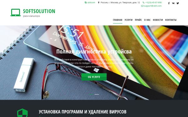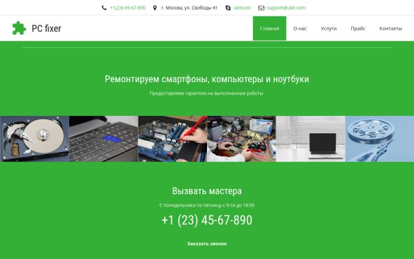простой макет сайта сервисного центра, готовый к использованию после непродолжительного редактирования. Главная страница встречает посетителей привлекательным слайдером с интересными и полезными предложениями. Есть разделы с услугами и прайс, который легко изменяется с помощью визуальных инструментов uKit. Реализована форма онлайн-заказа выполнения работ.