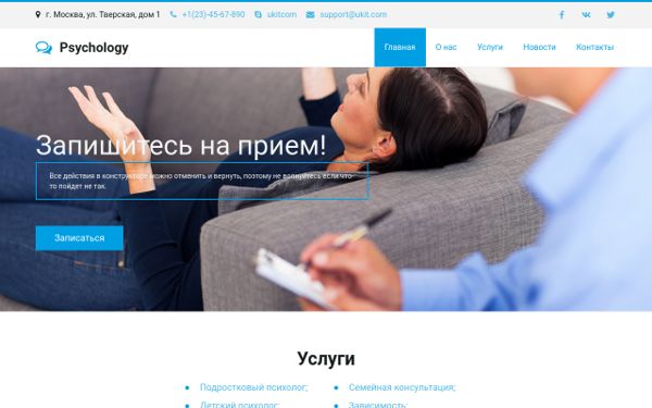 Макет бизнес-сайта для продажи практически любых видов офисных услуг. Современный дизайн с демо-контентом, спокойная сине-белая гамма, много графических элементов и формы для записи на консультацию. Блоки услуг и преимуществ, краткое резюме специалистов, порядок сотрудничества, отзывы клиентов, подробный блок контактов с картой проезда — всё на своих местах.