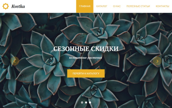 магазинный шаблон для продажи растений с продуманным каталогом и логичной структурой. На главной странице размещён слайдер, который можно использовать для презентации хитов продаж. Все товары разделены на категории для удобства навигации. Есть возможность заказать обратный звонок или написать менеджеру. Кроме каталога есть также блоговый раздел, в котором публикуются полезные материалы о растениях и уходе за ними.