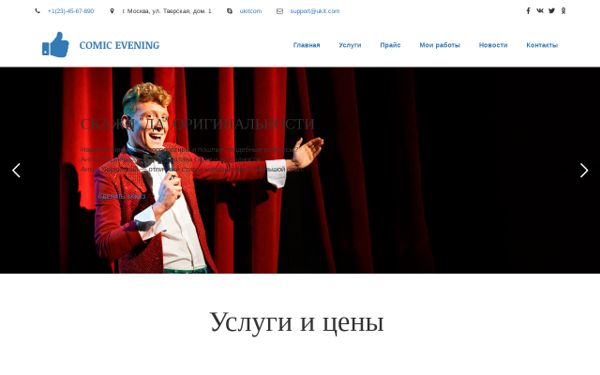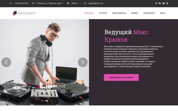 Выразительный одностраничный макет для презентации услуг конферансье, тамады, диджея или певца, к примеру. Яркое оформление, крупные фотографии, контрастные переходы передают праздничный настрой. Анкорное меню позволяет быстро переходить между блоками услуг, портфолио, преимуществ, стоимости и контактов. Собрать заявки помогут несколько форм обратной связи.
