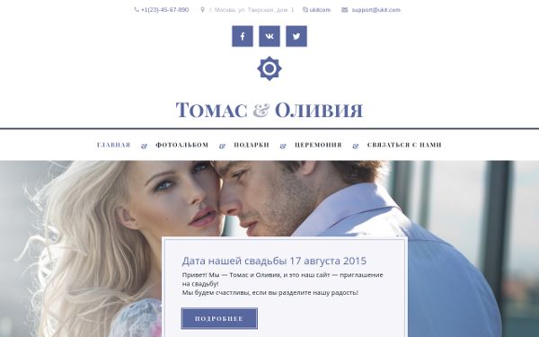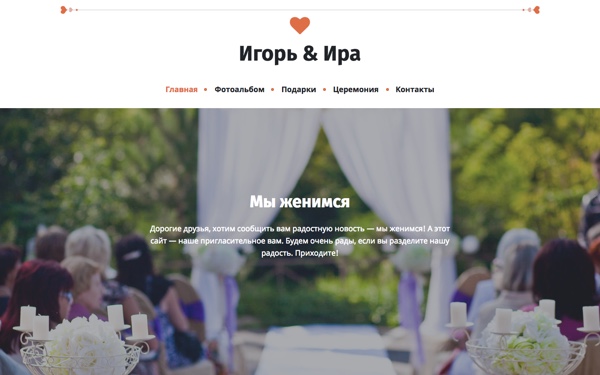 Лендинг анонса свадебной или другой личной церемонии. Послужит приглашением для друзей и близких на торжество. Светлый, чистый дизайн с крупными фотографиями, блоками информации о дате, месте проведения и расписанием мероприятия. Карта проезда и подробные контактные данные сориентируют гостей, которые, наверняка, захватят с собой отличные подарки.
