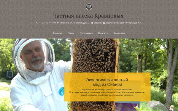 Шаблон подходит не только для продажи мёда, но и других натуральных продуктов: чая, молока, мяса, кондитерских и любых других съедобных изделий. Шапка из коллажа изображений продукции, блок с её описаниями, ассортиментом и ценами, а также формой оставления заявок и контактами. Макет яркий, можно использовать в связке с магазинным модулем или без него.