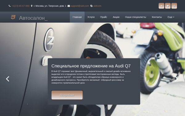 универсальный макет, который можно за несколько часов превратить в привлекательный сайт, используя встроенные инструменты визуального редактора uKit. Дизайн подходит для создания разных проектов, связанных с автомобилями — это может быть как продажа товаров, так и оказания услуг: например, ремонта или проката. Для решения этих задач на сайте есть раздел с прайсом и галерея, предназначение которой можно свободно менять.