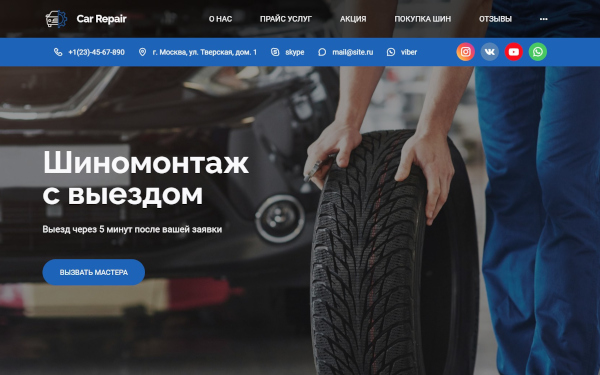 Компактный лендинг для шиномонтажной мастерской или шинного сервиса. Перечень услуг по замене, балансировке и ремонту шин, сезонному хранению колёс. Прайс-лист, график работы, контакты с картой проезда и форма записи на обслуживание. Оптимизированная структура для продвижения по запросам шиномонтажа и ремонта шин.