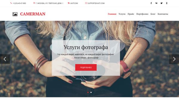 отличный вариант для индивидуального портфолио фотографа. В слайдере можно показать главные услуги и специальные предложения. Есть готовые блоки с преимуществами и особенностями работы. Если сайт предназначен для группы фотографов, можно показать их всех в блоке «Команда». На главной странице также выведена галерея с примерами работ. Больше фотографий можно посмотреть в специальном разделе «Галерея работ».