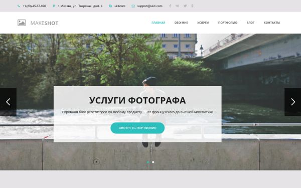 качественный макет для сайта фотографа, который поможет показать его услуги и примеры выполненных работ. На главной странице предусмотрен блок для рассказа о специалисте. Ниже расположена секция со списком основных услуг. Примеры работ можно посмотреть в разделе «Портфолио». Часть фотографий можно вывести на главную страницу сайта — визуальные инструменты редактора uKit позволяют сделать это без навыков программирования.