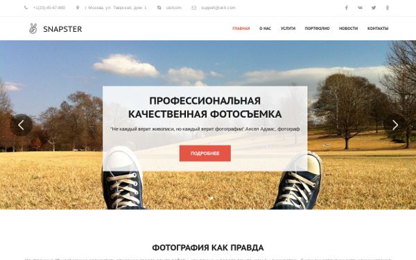 привлекательный шаблон для фотостудии с логичным акцентом на фотографиях. Слайдер на главной странице рассказывает о работе фотографов и специальных предложениях. Для презентации услуг используются галереи с примерами работ, а также карточки товаров с краткими описаниями и указанием стоимости. Для повышения уровня доверия на главной странице размещаются отзывы клиентов.