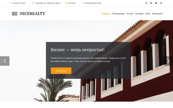 шаблон для создания сайта агентства недвижимости, направленного на международный рынок. Структура макета позволяет показать особенности сотрудничества с компанией, а также каталог имеющихся предложений. Для поддержания международного статуса проекта понадобится создание версии сайта на других языках. Это тоже можно сделать на конструкторе uKit, сделав копии исходного шаблона и добавив переведённые тексты.