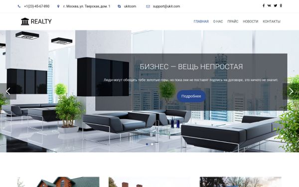 продуманный до мелочей шаблон агенства недвижимости, которое специализируется на работе с малым и средним бизнесом. На главной странице размещён слайдер, в котором можно публиковать специальные предложения или новости о предстоящих акциях. Есть блок с популярными предложениями и услугами, из которого можно перейти к полному каталогу и подробным описаниям, а также галерея с широкоформатными фотографиями и прайс с таблицей и загруженными документами.