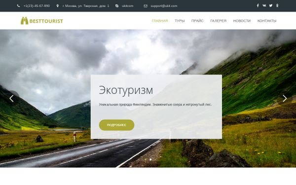 готовое решение для турагентства или компании, занимающейся организацией различных туров. На главной странице есть слайдер, который можно использовать для рассказа о горящих турах и специальных предложениях. Ниже размещён блок с карточками услуг, к каждой из которых прикреплена ссылка на подробную информацию. Для привлечения внимания используется также фотогалерея и отзывы клиентов.