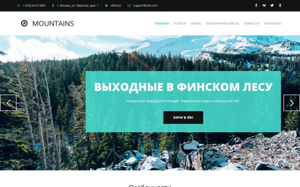 расскажите с помощью этого шаблона о возможностях и преимуществах экологического туризма. В слайдере можно разместить важные сообщения или информацию о специальных предложениях. На главной странице есть блоки под описание услуг с возможностью забронировать место в очередном туре через форму обратной связи. Все страницы наполнены примерами контента и готовы к редактированию с помощью визуальных инструментов uKit.
